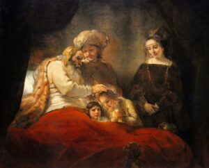 According to legend, Rembrandt’s affinity for Jews began as neighborhood camaraderie; he lived in an area of Amsterdam populated by Jews and artists. Scholars analyzing Rembrandt’s unusual inclusion of Joseph’s wife in Jacob Blessing the Sons of Joseph (see illustration) conjectured that Rembrandt learned from rabbis about a midrash placing her at the scene. Others speculated that Rembrandt switched to a darker palette in the 1650s while mourning the harsh Jewish censure of his supposed friend, the philosopher Baruch Spinoza.