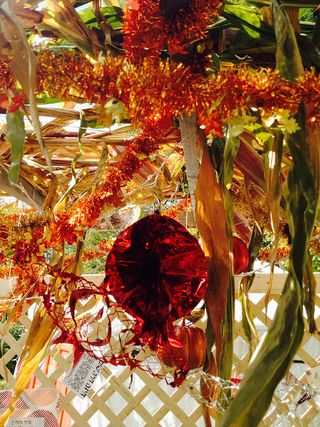 I spent much of the first day of Sukkot bundled up in the sukkah: jeans, socks, fuzzy slippers, a shirt, a sweater, a jacket, a knitted hat and scarf, and fingerless gloves. Above me the cornstalks rustled in the breeze. Occasionally yellow maple leaves drifted down from one of the trees overhead and made their way through the schach of the roof to land on my laptop. I was chilly, but I stayed out for a long time.