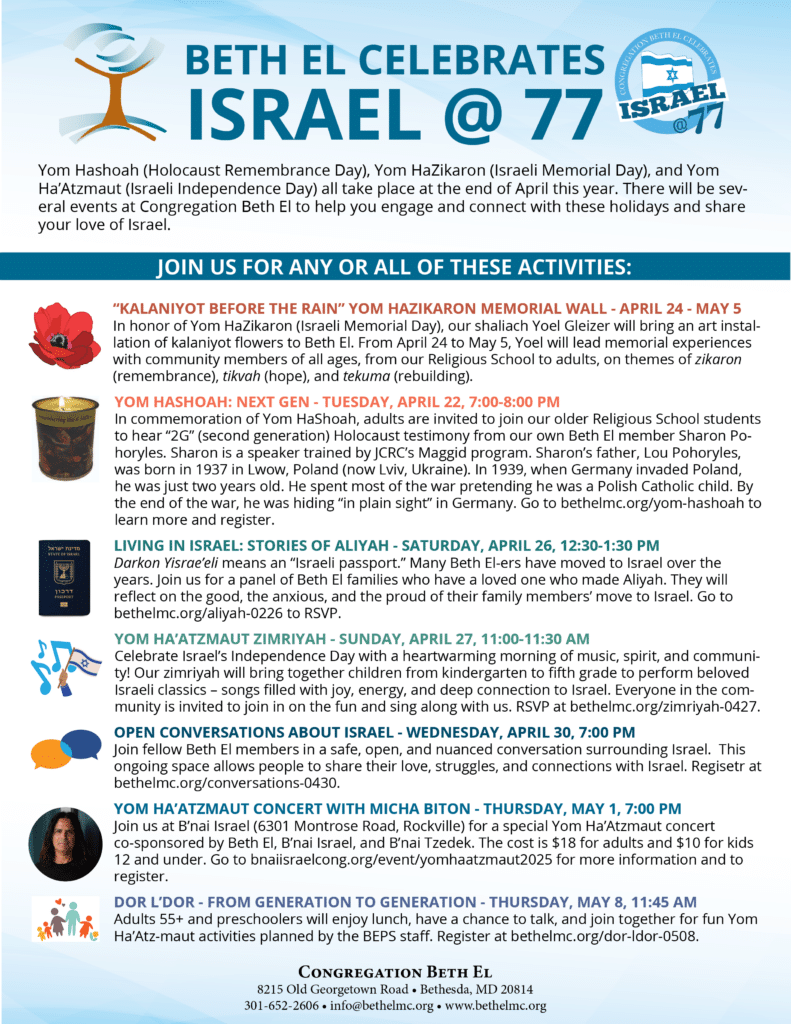 Beth El’s Am Yisrael Chai guides the plethora of Israel-related activities; to join this committee, please email israel@bethelmc.org.
