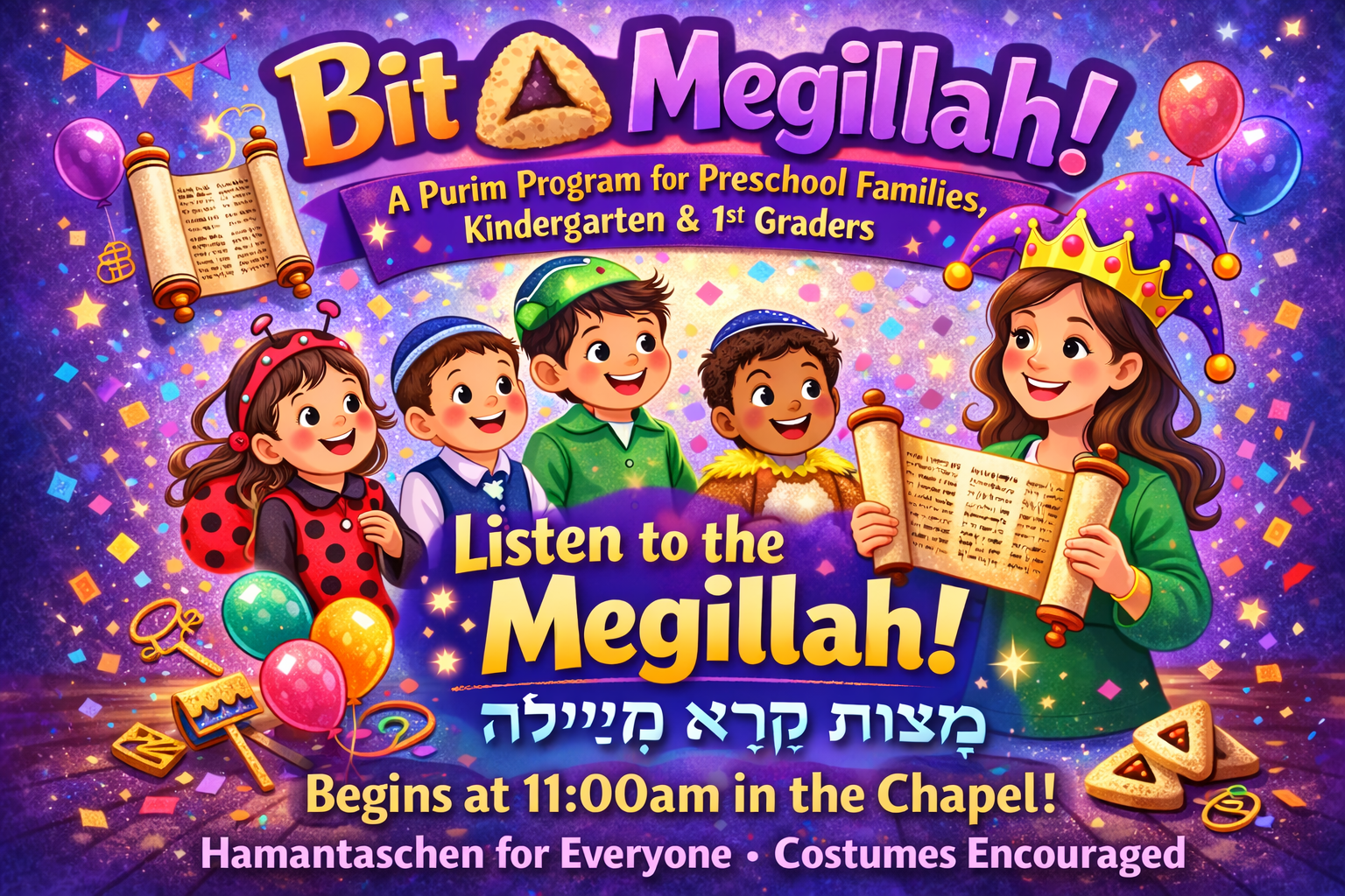 Come hear a bit of the Megillah with our very own Lisa Arber (AKA the Parsha Lady) on Sunday, March 1, at 11:00 am. Did you know it’s a mitzvah to hear the story of Purim? BERS Kindergarten and first graders will join with their classmates and teachers. Parents and families with preschoolers are welcome to attend.