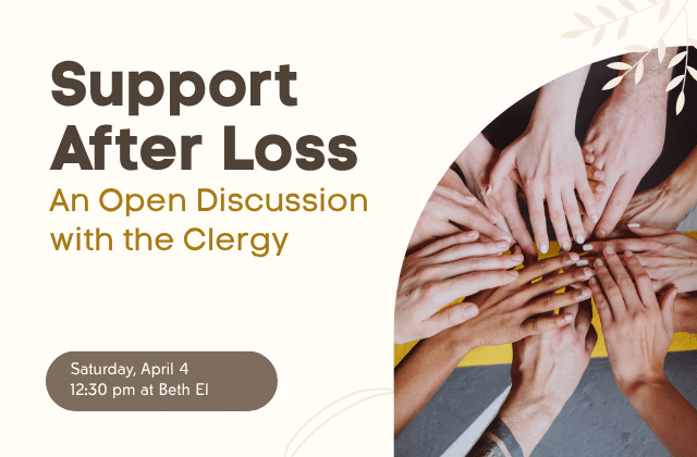 Featured April 4, 2026 at 12:30 pm Support After Loss Support After Loss Congregation Beth El 8215 Old Georgetown Rd, Bethesda, MD, United States With a special invitation to those who have had a recent loss, we will gather for a brief teaching and discussion led by a member of the Beth El Clergy. ...