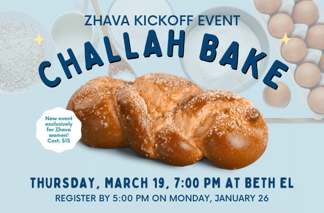 Zhava Challah Bake Featured March 19 at 7:00 pm Congregation Beth El 8215 Old Georgetown Rd, Bethesda, MD, United States Zhava* Kickoff – Come bake with us! Join Zhava for a challah bake with Walla Challah on Thursday, March 19, 7:00 pm. Whether you’re a seasoned challah baker or a novice, there’s always something new to discover! Learn a new challah recipe, mix and mingle with Zhava women over drinks and snacks, and take home ... $15
