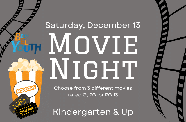 December 13 at 5:45 pm Beth El Youth Movie Night Congregation Beth El 8215 Old Georgetown Rd, Bethesda, MD, United States Save the date for our Beth El Youth Movie Night! Join us at 5:45 pm for Havdalah, then leave the kids with us from 6:00-9:00 pm - they'll have pizza for dinner and watch movies with their Beth El friends. Kids should come in PJs with a sleeping bag or pillow and a stuffy to ...