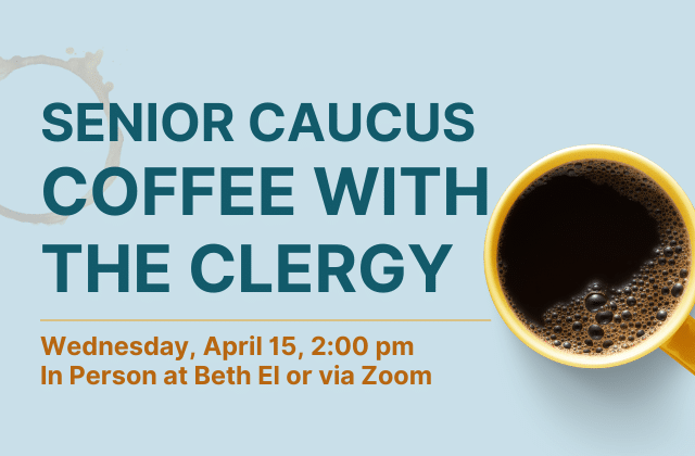 Coffee with the Clergy Featured April 15 at 2:00 pm - 3:00 pm Coffee with the Clergy Congregation Beth El 8215 Old Georgetown Rd, Bethesda, MD, United States Senior Caucus Coffee with the Clergy on Wednesday, April 15, from 2:00 to 3:00 pm. This every-other-month gathering is an informal time to catch up with fellow congregants, hear updates about what is happening at Beth El and in the news, enjoy light refreshments, and do some Jewish learning together. Rabbi Harris will lead the ...