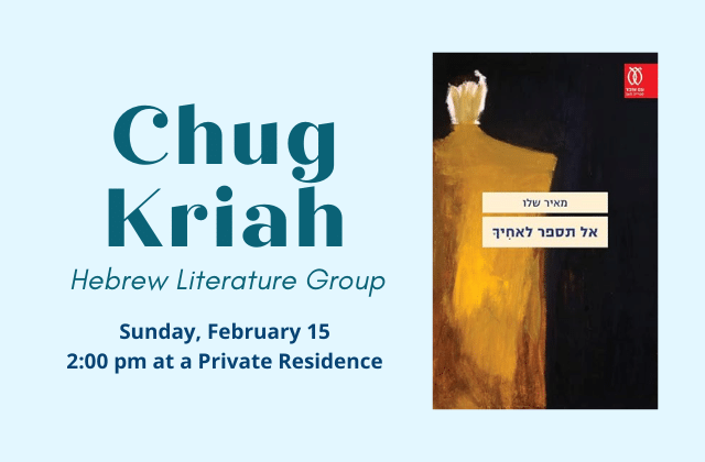 Chug Kriah Featured February 15 at 2:00 pm Chug Kriah meets regularly to read and discuss modern Israeli literature in Hebrew. Our next meeting will be on February 15, 2:00 pm, at a private residence. We are reading Al Tesaper L'achicha (“Don’t Tell Your Brother”) by Meir Shalev. For more information including the address, please contact Bill Kanter at kanterdsw@aol.com.