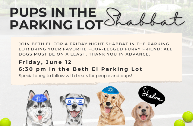 Pups in the Parking Lot Shabbat Featured June 12 at 6:30 pm Congregation Beth El 8215 Old Georgetown Rd, Bethesda, MD, United States Join us for one of our favorite summer gatherings, Pups in the Parking Lot Shabbat. This is a laid-back, relaxed outdoor Shabbat experience – casual attire encouraged. Stay for the oneg after the service to connect with familiar faces, make new friends, and pet some dogs! All well-behaved dogs on leashes are invited to join ...