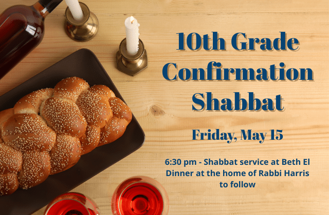 Celebrate with our 10th-grade students and their families as we come together on May 15 at Beth El for Shabbat services and dinner. Services start at 6:30 pm at Beth El. Dinner follows the service and will be held at the home of Rabbi Harris.