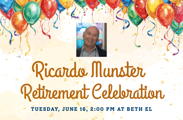 Ricardo Munster Retirement Celebration June 16 at 2:00 pm Congregation Beth El 8215 Old Georgetown Rd, Bethesda, MD, United States Ricardo joined the Beth El staff in 2006. For 20 years he has served in many different capacities, including administrative assistant to the clergy, liaison for b’nai mitzvah families, and ...