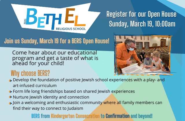 Featured 6:00 pm Shabbat Together: A Family Shabbat Service Featured December 19 at 6:00 pm Shabbat Together: A Family Shabbat Service Join Beth El Religious School (BERS) for a joyful and engaging Shabbat experience designed especially for children in grades K–5 and the adults who love them. $15
