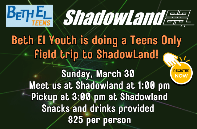 5:45 pm - 9:00 pm Beth El Youth Movie Night December 13 at 5:45 pm - 9:00 pm Beth El Youth Movie Night Save the date for our Beth El Youth Movie Night! Join us at 5:45 pm for Havdalah, then leave the kids with us from 6:00-9:00 pm - they'll have pizza for dinner and watch movies with their Beth El friends. Kids should come in PJs with a sleeping bag or pillow and a stuffy to ...