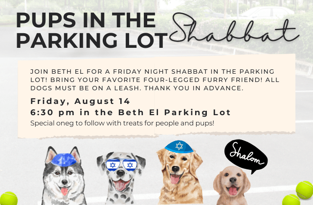Join us for one of our favorite summer gatherings, Pups in the Parking Lot Shabbat. This is a laid-back, relaxed outdoor Shabbat experience – casual attire encouraged. Stay for the oneg after the service to connect with familiar faces, make new friends, and pet some dogs!