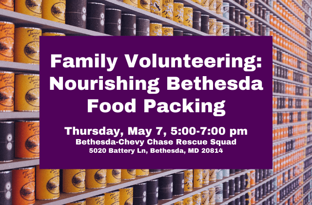 Join Beth El families in packing produce and shelf-stable food for Nourishing Bethesda, a local nonprofit operating out of the Bethesda Chevy Chase Rescue Squad just up Old Georgetown Road. Volunteers must be 9 years or older. We are limited to 15 participants.