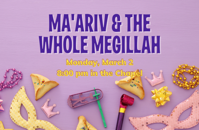 Join us on Monday, March 2, at 8:00 pm as Minyan Chaverim leads Ma’ariv and The Whole Megillah. This lively, upbeat, and communal service is led by lay leaders who like to bring some zaniness to the Megillah experience by adding character voices and other surprises to the reading. Everyone is invited to join in the fun!