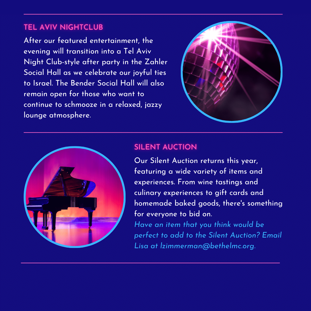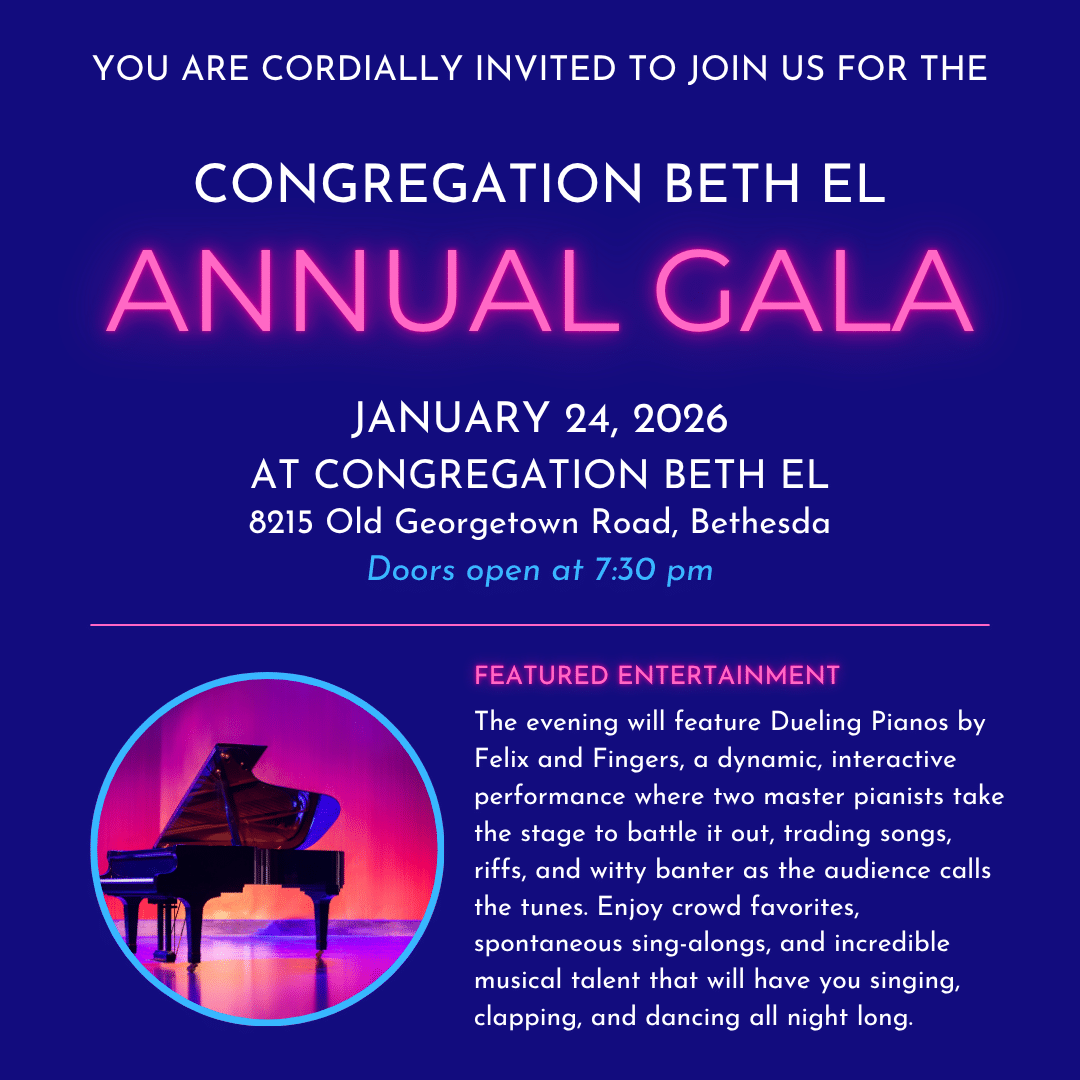 Join us for the Congregation Beth El Annual Gala on Saturday, January 24, 2026. Doors open at 7:30 pm. There will be tapas, drinks, and desserts, dueling pianos, a night club, silent auction, and more!