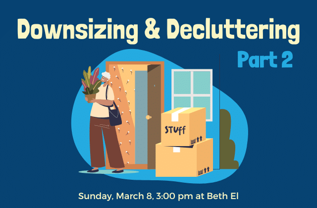 Featured March 8 at 3:00 pm - 4:00 pm Downsizing & Decluttering – Part 2 Congregation Beth El 8215 Old Georgetown Rd, Bethesda, MD, United States Please join Beyond BEENs for a presentation by Jodi Eisner, MSW and Certified Professional Organizer, to discuss challenges and tips for downsizing and decluttering. The presentation will be followed by a panel of Beth El congregants who have successfully survived the process. There is no charge for the program but we request that you register ...