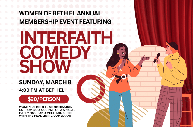 Women of Beth El Annual Membership Event, Including the Interfaith Comedy Show Featured March 8 at 4:00 pm Congregation Beth El 8215 Old Georgetown Rd, Bethesda, MD, United States Women of Beth El presents the Interfaith Comedy Show! The full congregation is welcome to join the Women of Beth El at 4:00 pm on Sunday, March 8 for an ... $20