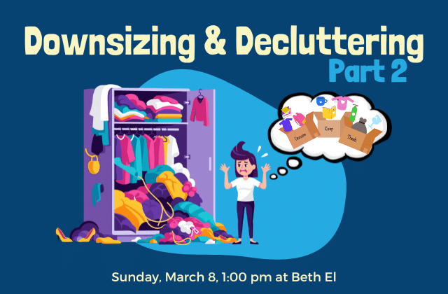 Featured March 8 at 1:00 pm - 3:00 pm Downsizing & Decluttering – Part 2 Congregation Beth El 8215 Old Georgetown Rd, Bethesda, MD, United States Please join Beyond BEENs for a presentation by Jodi Eisner, MSW and Certified Professional Organizer, to discuss challenges and tips for downsizing and decluttering. The presentation will be followed by a panel of Beth El congregants who have successfully survived the process. There is no charge for the program but we request that you register ...
